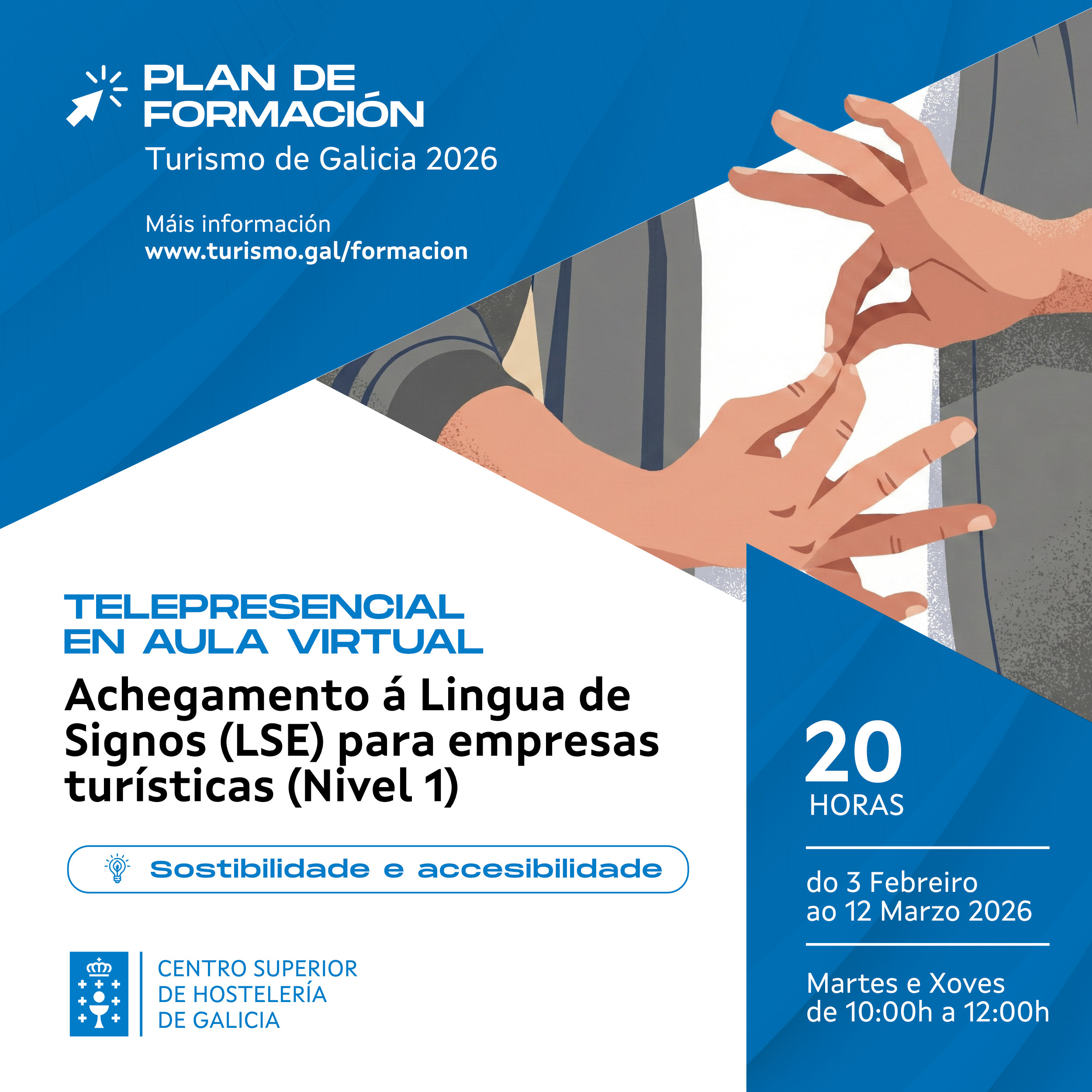 Dentro do Plan de Formación de Turismo de Galicia 2026, inclúese a Formación en Lingua de signos e comunicación con persoas xordas co obxetivo de ampliar coñecementos e mellorar cada vez máis a cualificación profesional dos traballadores do sector turístico galego, mellorar a atención e a comunicación coas persoas xordas e xordocegas no ámbito do turismo en Galicia e favorecer unha sociedade máis inclusiva.