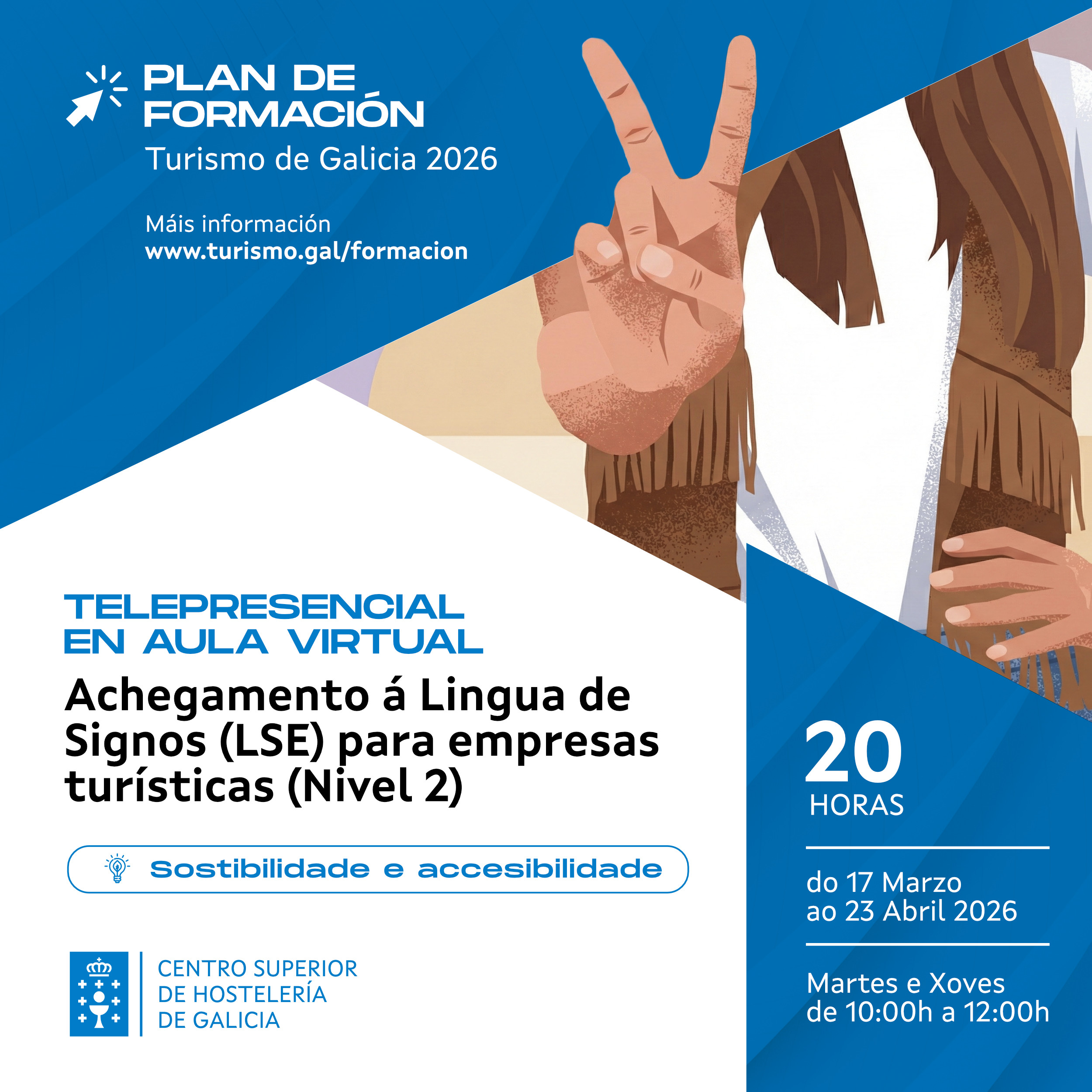 Dentro do Plan de Formación de Turismo de Galicia 2026, inclúese a Formación en Lingua de signos e comunicación coas persoas xordas co obxetivo de ampliar coñecementos e mellorar cada vez máis a cualificación profesional dos traballadores do sector turístico galego, mellorar a atención e a comunicación coas persoas xordas e xordocegas no ámbito do turismo en Galicia e favorecer unha sociedade máis inclusiva.